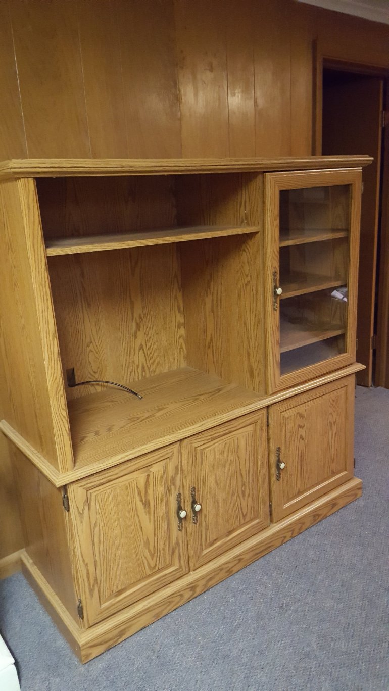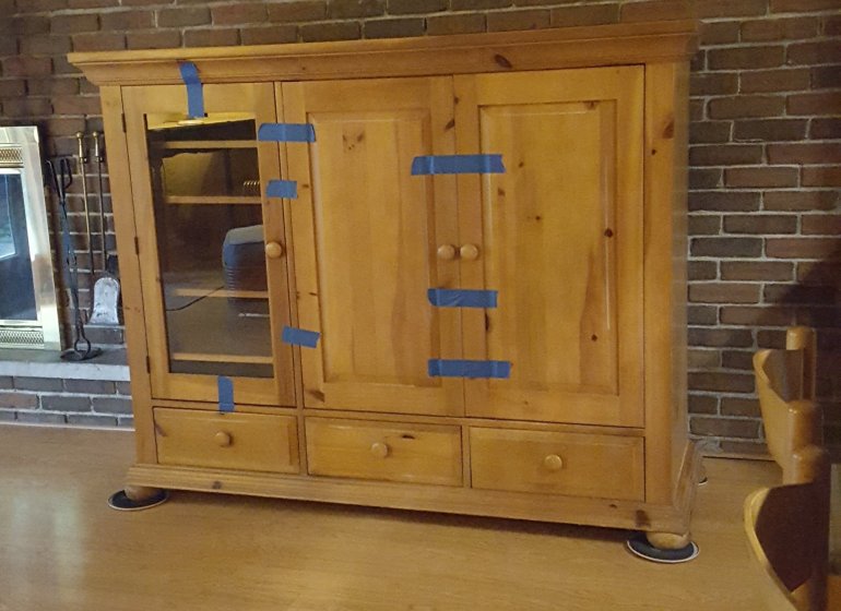 Now I’m here with a broken piece of furniture down the basement and a huge media center upstairs in the middle of the room.