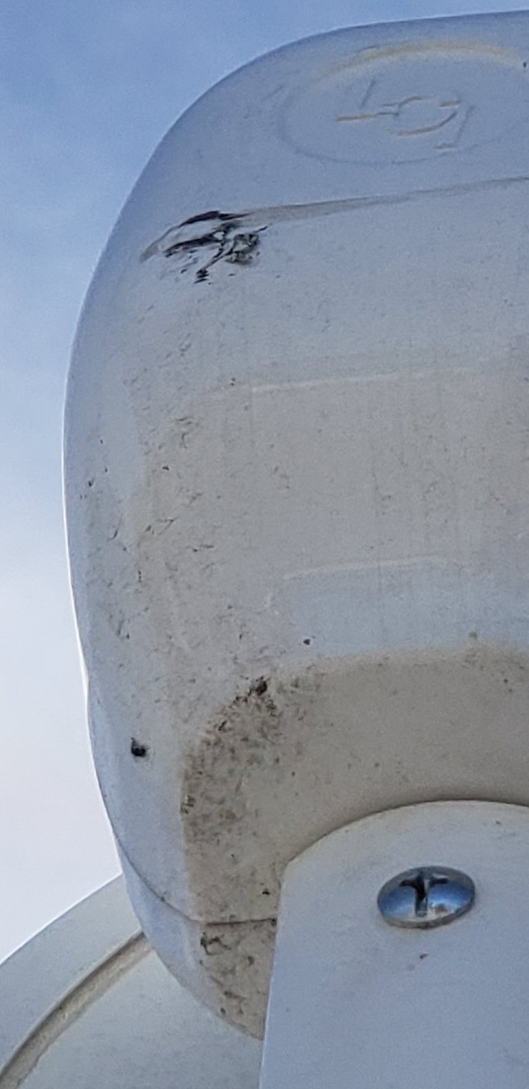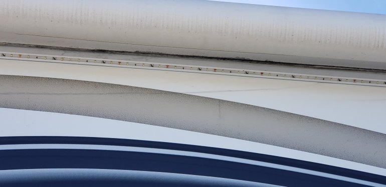 So a very slowly pulled out of the parking spot next to me, while I got out to inspect any damage. I looked at the mirror and it looked OK. So I went around the back and looked at the awning. And here’s a big black spot on the end of it where he bumped it way at the top. So I made the Cardinal sin of Walmart parking and opened the awning to see if it would work. It did. But by the time I got my phone out to take pictures, he already scooted into Walmart. Coward.