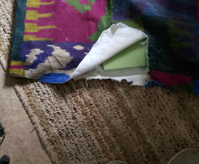 Remnants of the brown bath towel did he chewed and the white bath rug that he chewed.