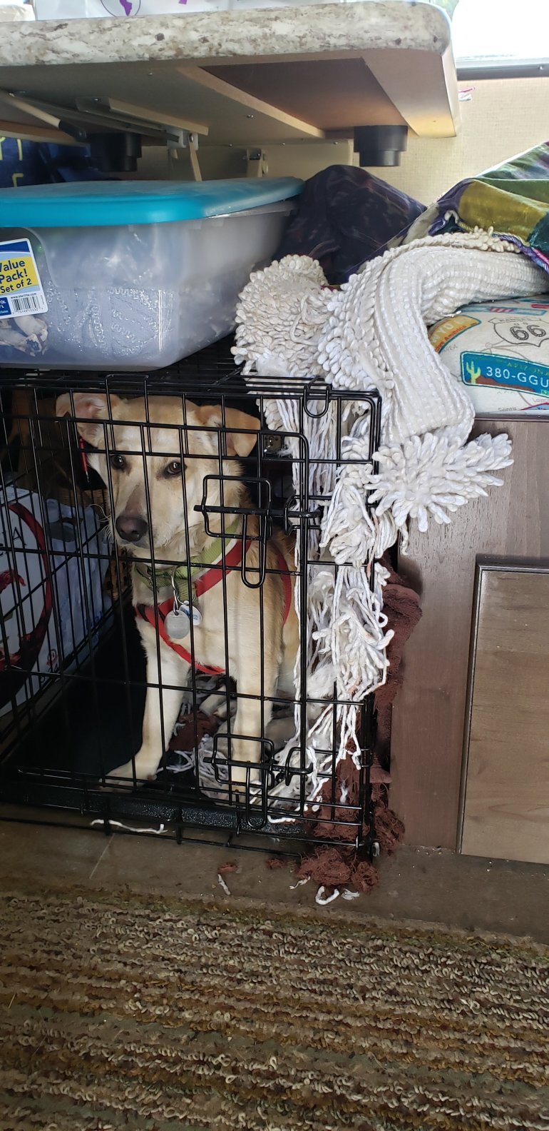 So I put him in the Create long with a big treat ball filled with peanut butter and treats and move him away from everything And this is what I came back to after being gone 15 minutes.