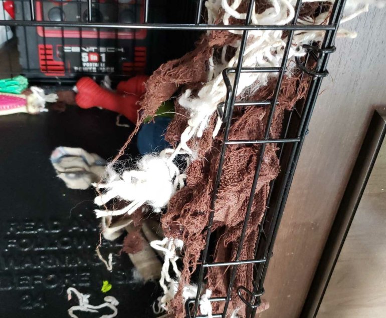 He had pulled the rug and the towel off the bench and pulled it through the cage and was ripping it to shreds.