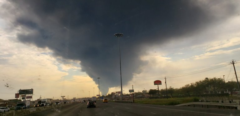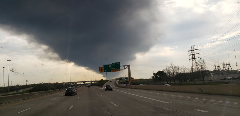 Drove thru the terrible chemical fire in Houston. It had been burning since Sunday. Its giant tanks of solvents and gasoline. 6 of the 7 tanks have exploded. When I was driving, I heard another explosion and then closed the I-10 West.