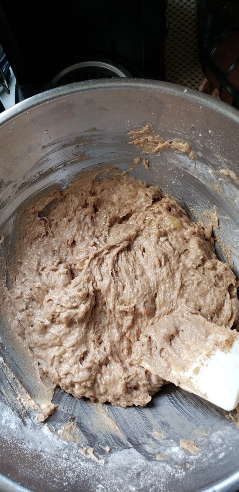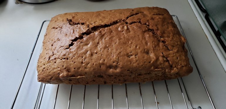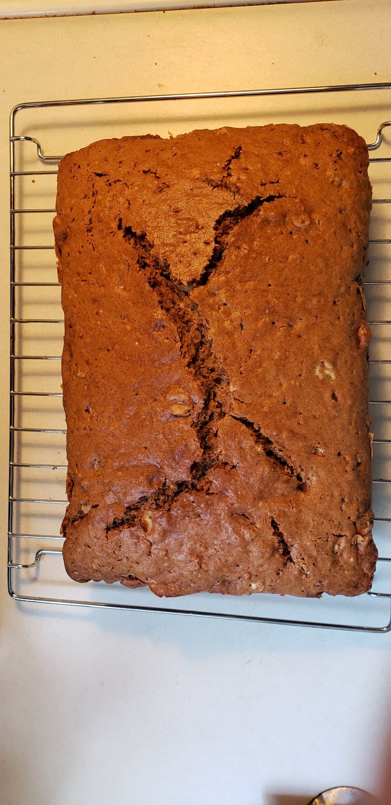 Don’t get me wrong…I love living in the camper. It’s just sometimes you get a hankering for something homemade.It all started with an overripe banana. Well, then the brain starts thinking, hey I’ve got an egg, leftover sugar, leftover flour, no milk, stick of butter, and some lemon juice. The Dollar General JUST got it in after waiting a month to add it to my iced tea.So I set out to make this concoction.Recipe first calls for 2 cups of flour. Well hell, I open the half bag of flour and it has tiny little critters running amuck. I had it in a Ziplock bag! Oh well, into the trash it went.Now I have to find where my big apothecary jar of flour is that at I used to keep on the counter in my house. I know it’s here somewhere.After tearing the pantry apart (which is 1/10th the size of my old cupboard), there it was. Laying on its side in the back. So now, it meant I had to pull everything in front of it to get to it. So be it.So after getting the jar of flour, I thought I should rearrange the pantry. Well 20 minutes later, I started measuring 2 cups of flour.Next ingredient calls for baking soda. Well hell, back into the pantry I go. Good luck finding that. Thank God it’s in a yellow box.So now to the wet ingredients. Mashed banana, check. Sugar check. It was natural raw brown sugar so I figured it would work. Then 2 eggs. Well shit. I only had 1 and I couldn’t tell if it was hard boiled or not. So had to get a bowl of water out to see if it either floated or sunk. Hell, I couldn’t tell so I just went for it and cracked it over the sugar and banana. Yeah!! It was fresh. Batter didn’t look right so I knew I was missing something. The damn stick of butter. So now back into the freezer I went looking fot that lone stick if butter I kept in case of an emergency. HaWell there it was in the back. Hard as a rock but still on the box and wrapper so looked great. Butter, check.After nuking it for 30 sec. Good to go. Stirred it into the batter. All good.Vanilla, check. Cinnamon, check.Milk, crap. I had hazelnut creamer. I can mix that with some water. Prison style. Oh yeah.To the “milk”, you need to add 2 tsp. of lemon juice to sour it to make it rise or something. So mixed up that potion and added it to the batter, alternating dumping in the flour and then milk, more flour, rest of milk.Geez, almost forgot the nuts!Off to the freezer AGAIN! After pulling everything out, found them in the door.So two big handfuls of walnuts, check.