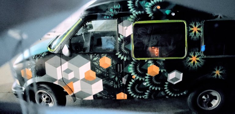 All done. Then hit the Lowe’s truck and stopped at Clinton OK. Got a parking spot for 2 cars so I didn’t have to take up a trucker spot. They work hard and need their sleep. Look at this van next to me. Pretty cool artwork.