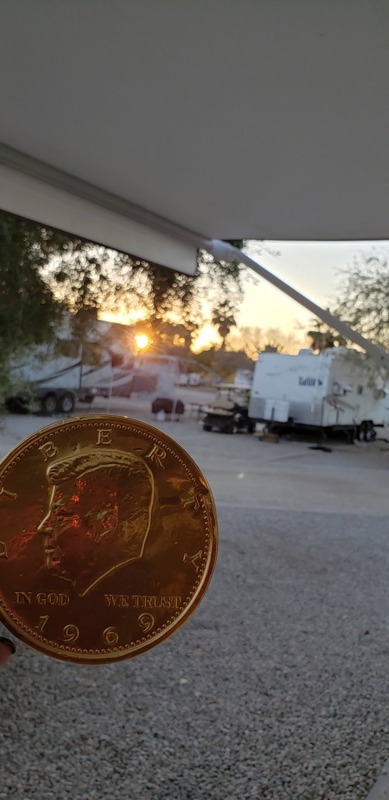 My cousin, Jim Keller, gave me this chocolate 50 cent piece at my Dad’s funeral and said “buy your camper”. So it travels with me and now it’s on the Colorado River.