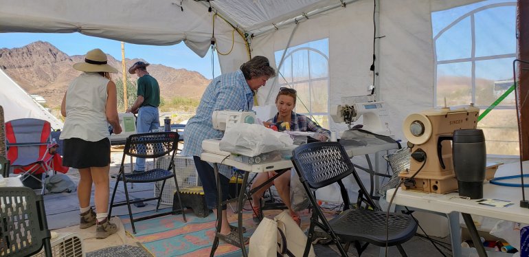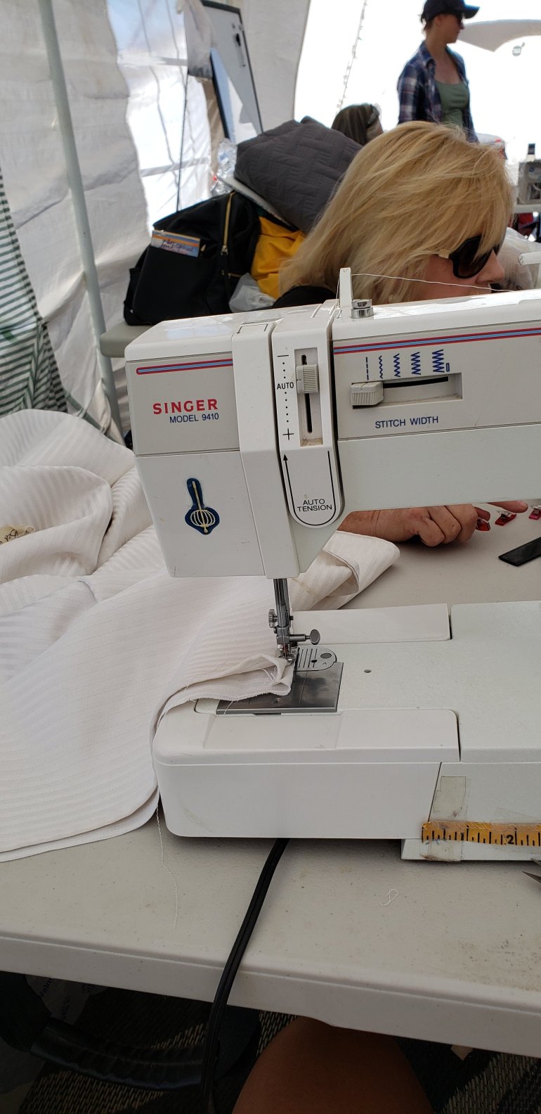 It’s hot in the sewing tent but we have a fan. About 10 sewers. And 5 helpers. It changes everyday. Some give up and walk but I could sit there all day and sew.