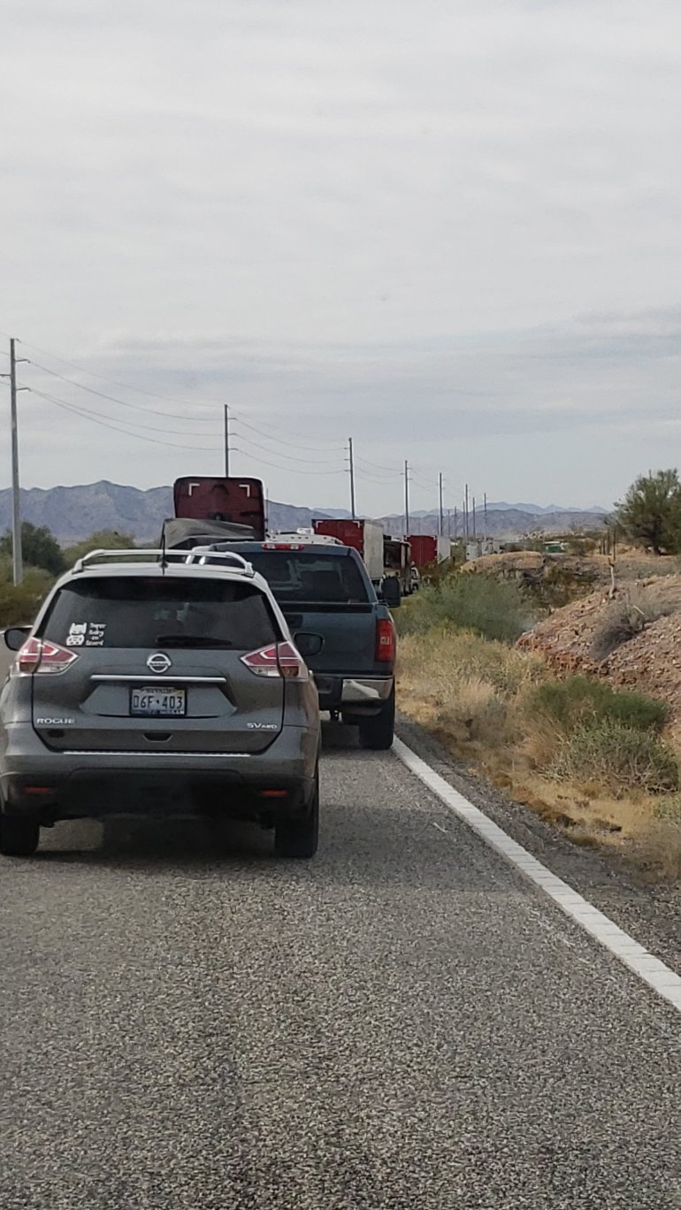 Biggest travel day of the year. Stay safe out there.Well, I went to Bouse today to get the mail. They close from 12 to 1 so I got to catch up on email while waiting.After getting the mail, I headed to Quartzsite. Only 5 miles ahead, stop dead traffic. I knew it was a bad wreck when I saw the helicopters.So I waited 45 minutes in traffic.