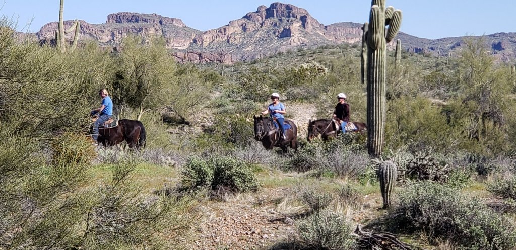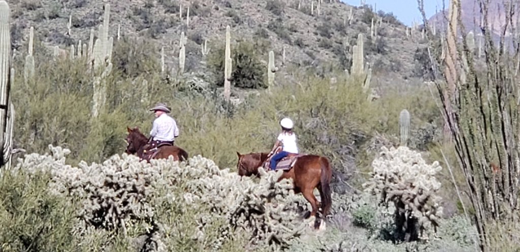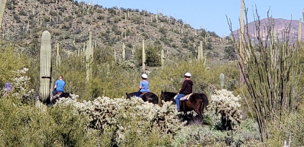 Whole line of them. Must be a riding class. Cowboy in front and back.