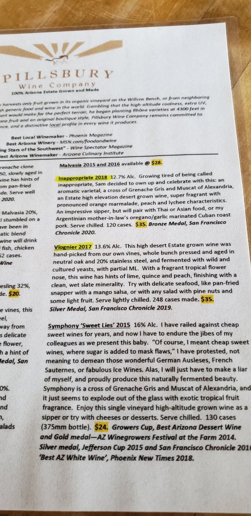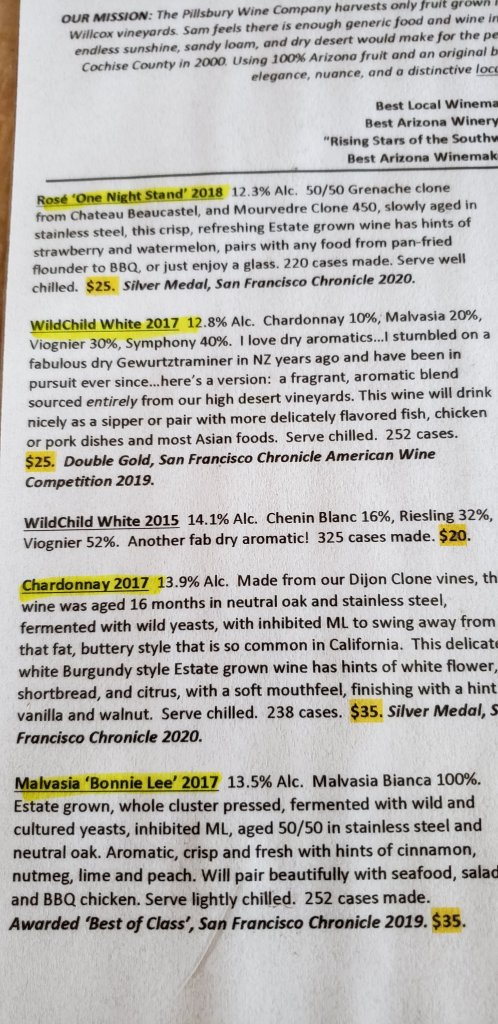 This particular Harvest Host is a Winery called Pillsbury Wine Company. And man, do they make good wine! No sugar in it and the names were a hoot. One was called “Inappropriate” another was called “Wild Child” and “One Night Stand”.