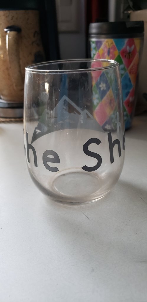 The 1st thing I tried voice as She Shed wine glass. Of course.