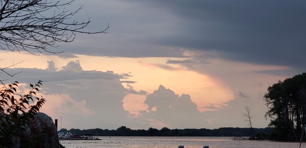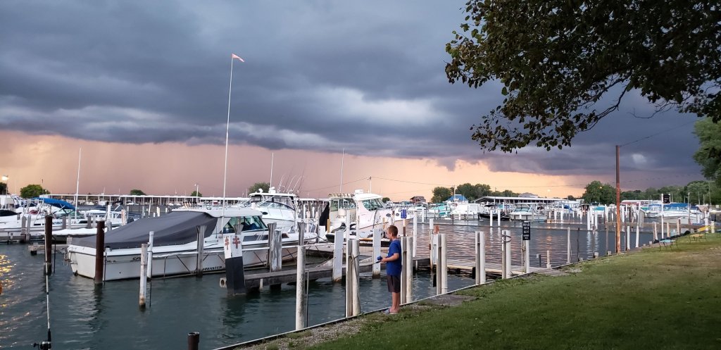 Crazy storm, sky dark and windy, lots of lightening over the lake.
