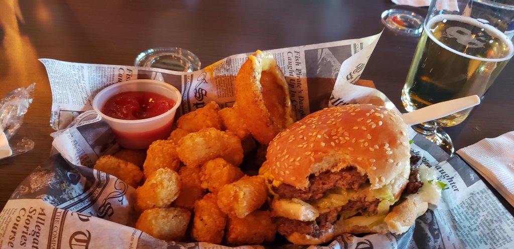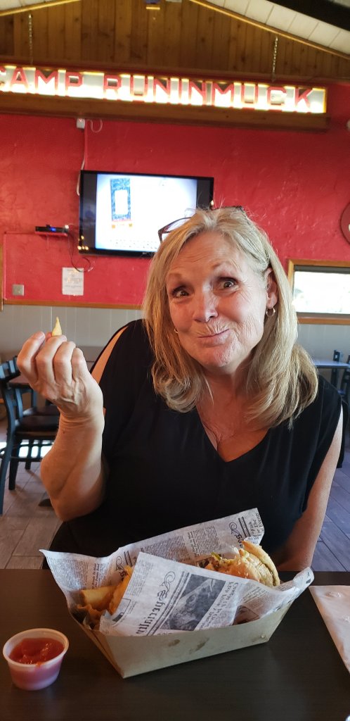 We ate at a great place called Camp Runamuck. This is the largest hamburger I ever ate in my life! You have to pay a membership fee to get in and she was a member. I will definitely join next summer.