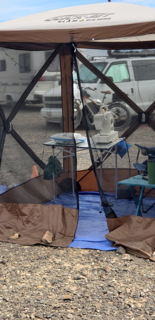 Had to put the sewing machine back in the rig because it is supposed to rain all day.
