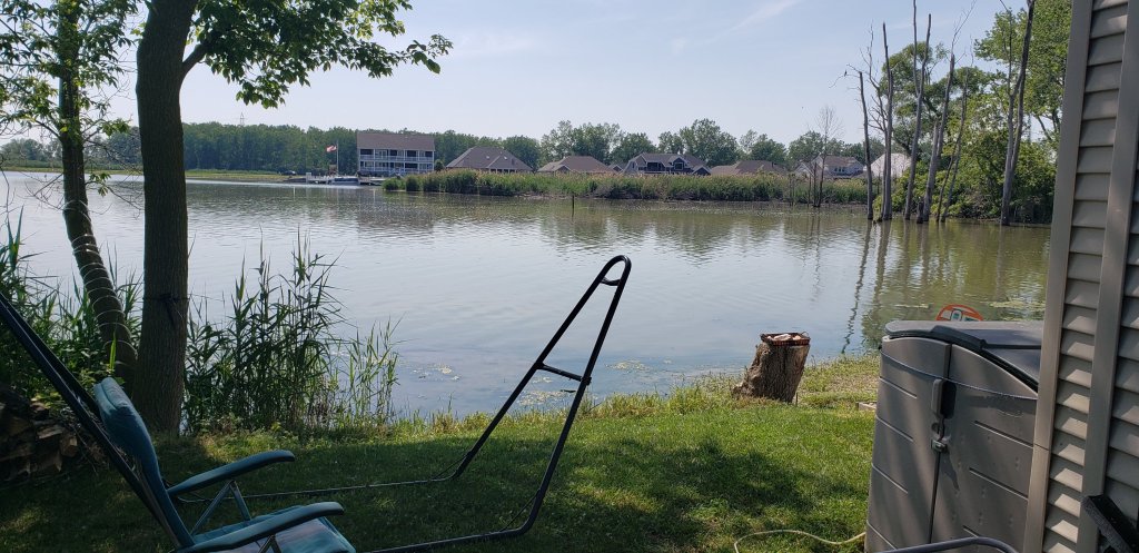 So I heard from the weather channel that it will be really dry this year and it will make the ticks come out. So I decided to weed wack the tall grasses at the beach level. So glad I did now I can see the water from the hammock.