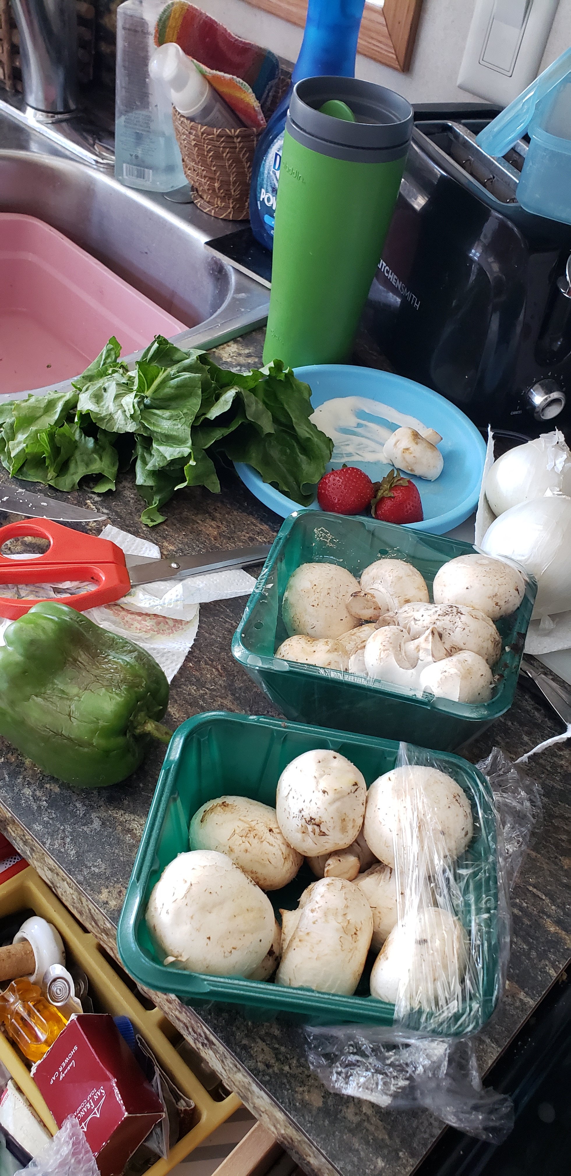 The Misfit Market order came in and I chopped and stored all of the produce  into ziploc bags and containers to keep the moisture out. I love these green boxes that keep it fresh by absorbing the gasses that cause overipening.