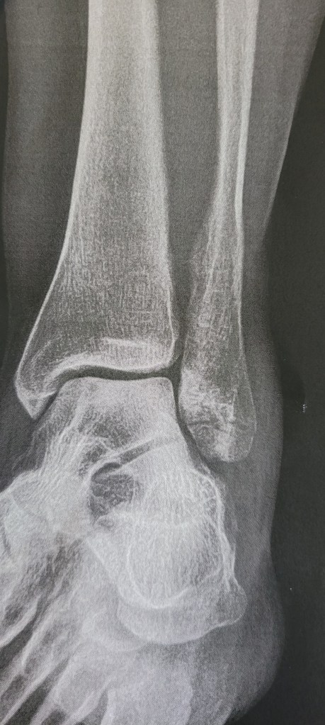 I’m at daughter’s house now in preparation of going to doctor tomorrow. She fell on a walnut while walking to rowing class and broke her foot (her fibula) see photo.