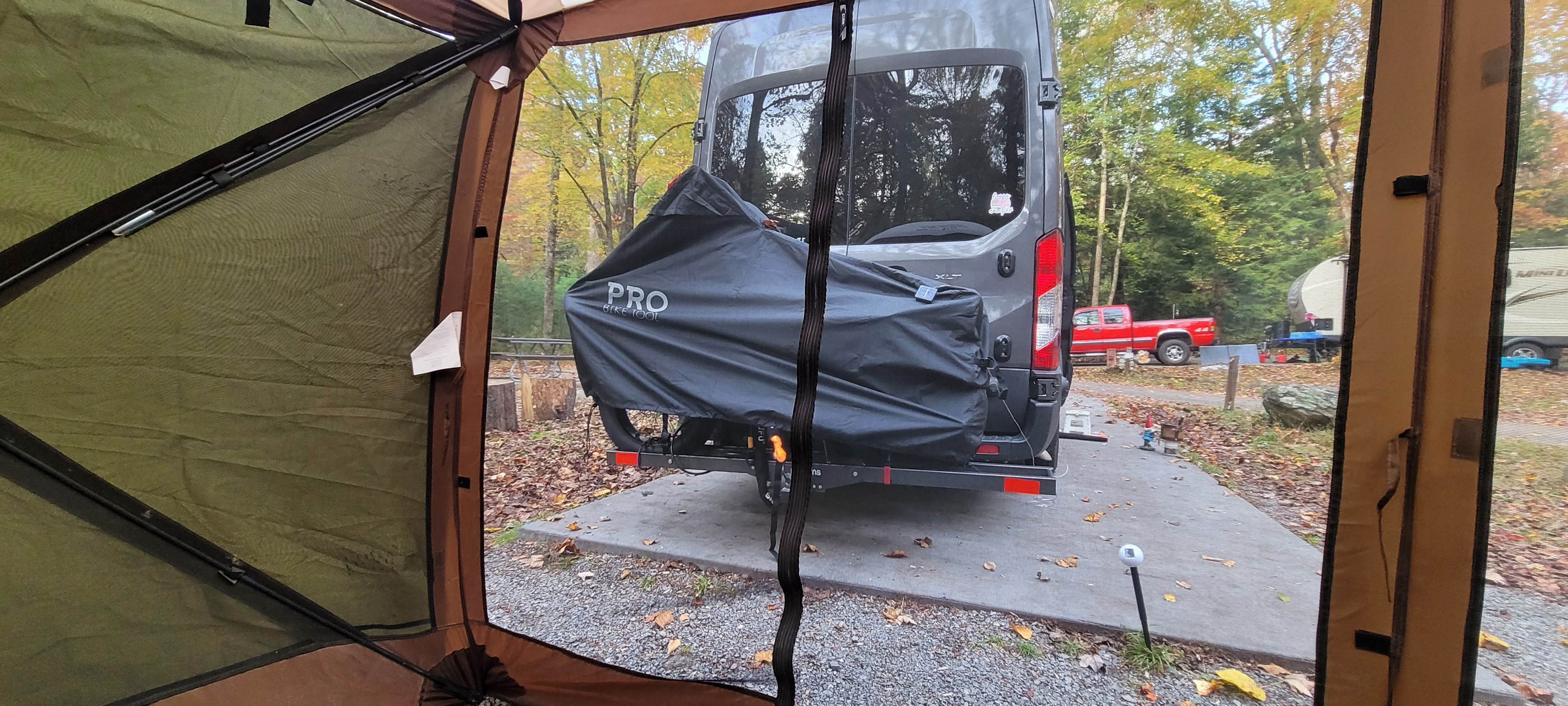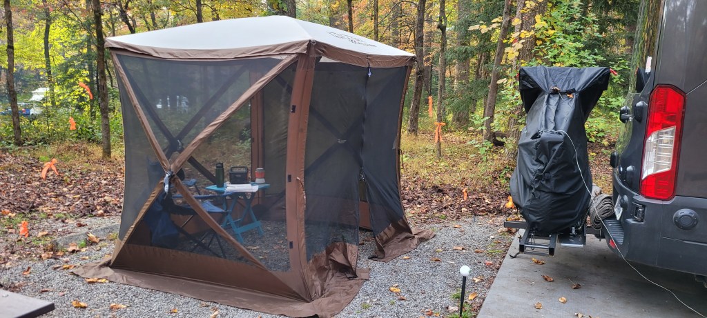 Well I drug the bike off the bike rack, undid all the Rachel straps. Moved the chairs and tables that were stacked next to it. And ride .8 miles and the skies opened up! It poured!