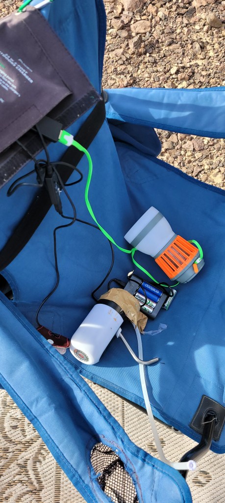 But I’m happy with my current set up. I use myt little 24v flip down charger for batteries, lights, solar chargers and bug zapper.