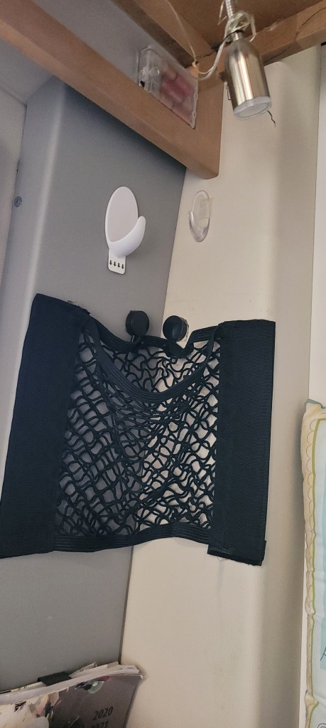 Decided to hang a mesh holder in the corner of the van. Last year, it melted in the 106° temps in storage at the Lake. It left a big mark on the wall where it melted the vinyl cover which pulled away from the ragwool insulation. Hopefully. This VHB tape will hold better. We shall see.