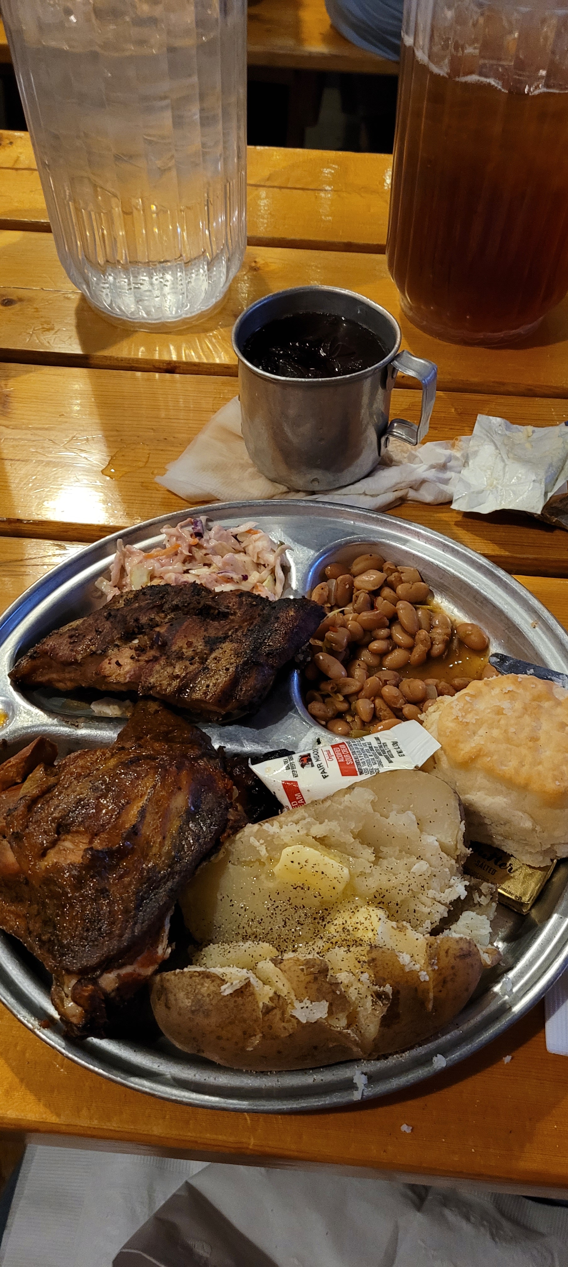 Dinner was BBQ chicken and ribs in Prickly Pear sauce. Huge baked potato, prickly pear slaw, cowboy beans, biscuits and apple crisp with ice cream. Iced tea and lemonade. I’M STUFFED.