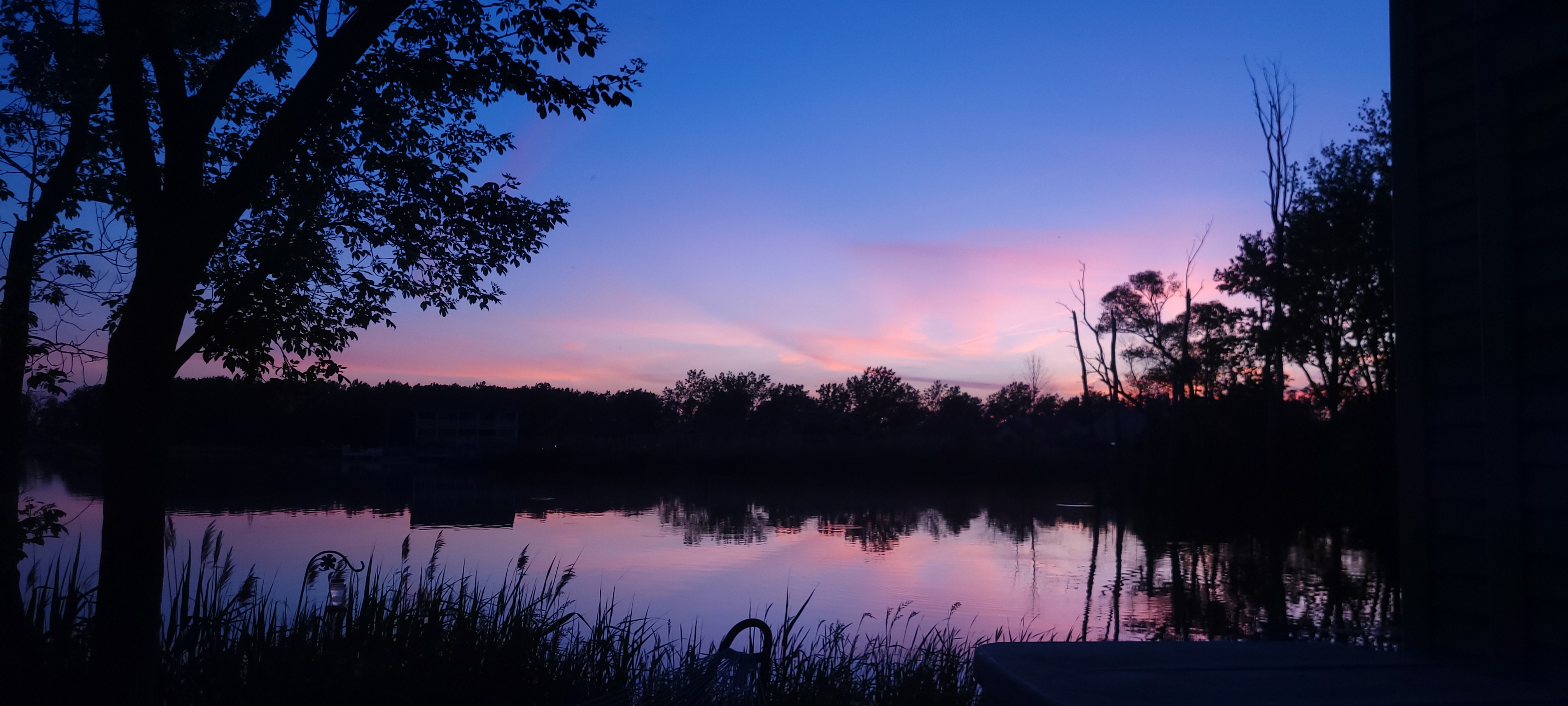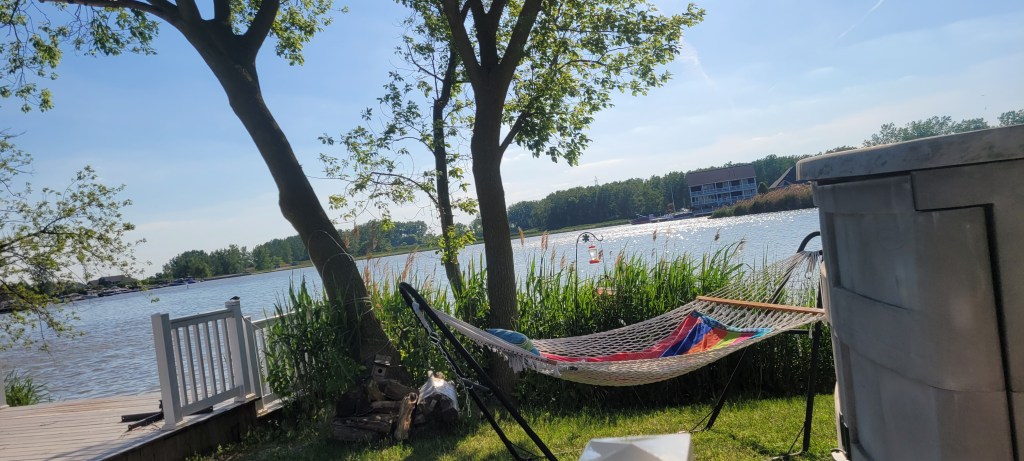 Then if that’s not enough, I’m laying on the hammock and this groundhog goes tearing across the yard and runs right under my hammock with me in it! I think I surprised him! He sure surprised me! He ran into the weeds on the shoreline. Must like the cool mud.