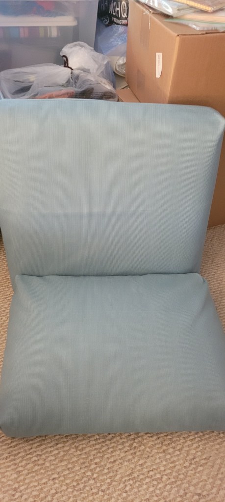 Finished Cousin Ellen’s cushion covers. She wanted them removable so she could wash them. Nice Sunbrella fabric.
