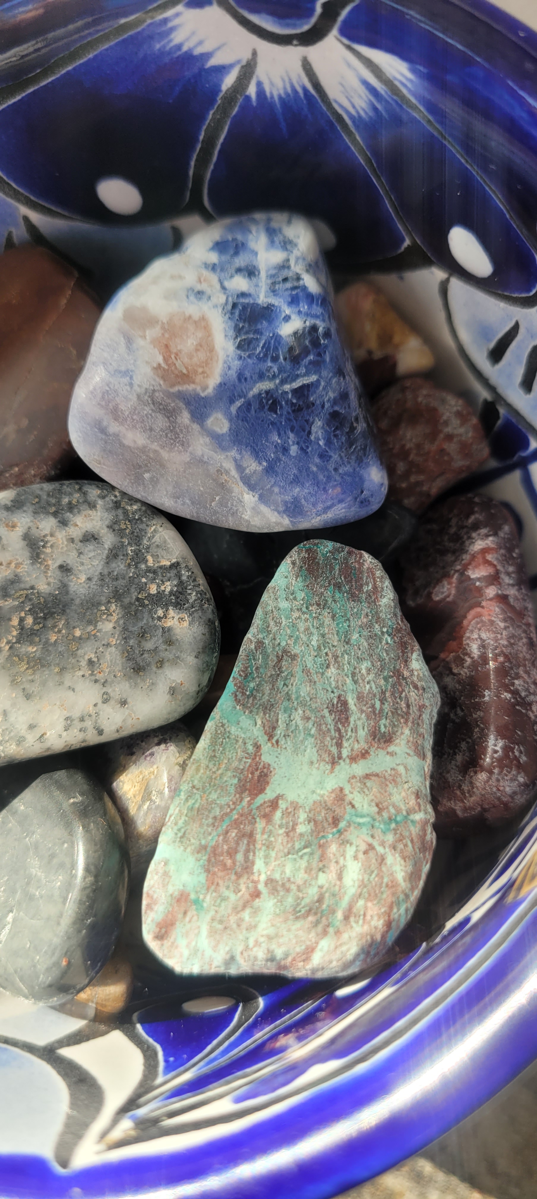 I found a small bag of rocks from my collection in my sewing room from Arizona. I put them in a bowl and started taking pictures of their beautiful colors. Some turquoise, amethyst and crystal.