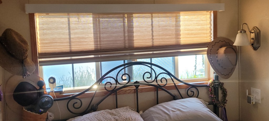 It looks blue but it is clear. Mirror on the outside so you can see out but you can’t see in. It went on pretty good but I dropped the squeegee in between the bed and the wall! Argh! I had to move the mattress since the bed is a built in! I was not a happy camper! But I got it moved and stuck my hand in the 2″ space between the wall and the frame.I got it out and finished the job!