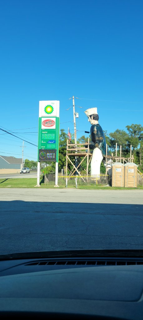 This statute has been here for years welcoming visitors to the drive through probably 1960’s. It has that Route 66 vibe. The drive through is long gone.