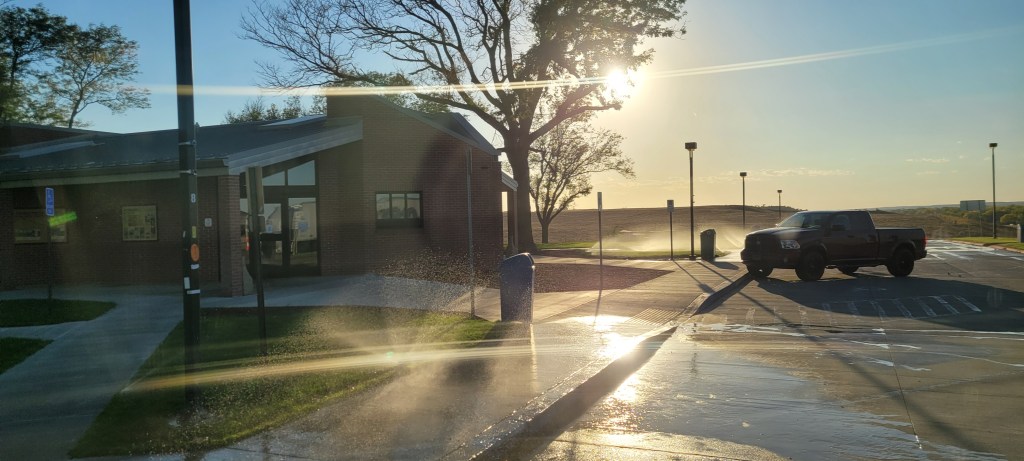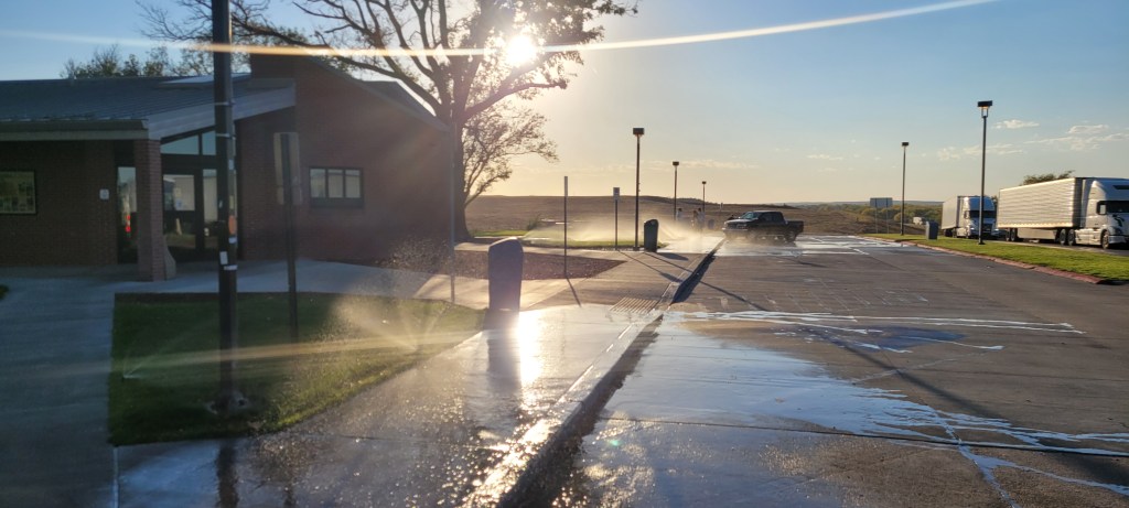 Spent the night at a Nebraska rest area. The sprinklers came on at 5:00pm much to the surprise of the people in the bathrooms. When they came out, their cars were soaked.