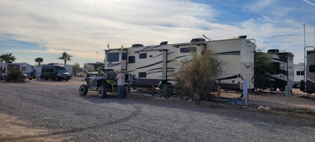 Very friendly people and I met Bobbie and her husband Harvey from Devil’s Tower, Wyoming. She had mentioned that she goes to Quartsite every year and It turns out and parked right across from her. She has a huge 5th wheel and a sise by side. They call these toy haulers Because you can put your side-by-side ATV right in the back of your rig.