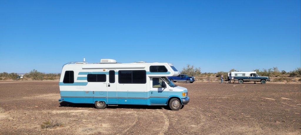 Went to Plomosa Rd camp. Eugene, Carolyn and Donnie here. Will go onto town to show Carolyn Quartzsite. She is from Fresno.