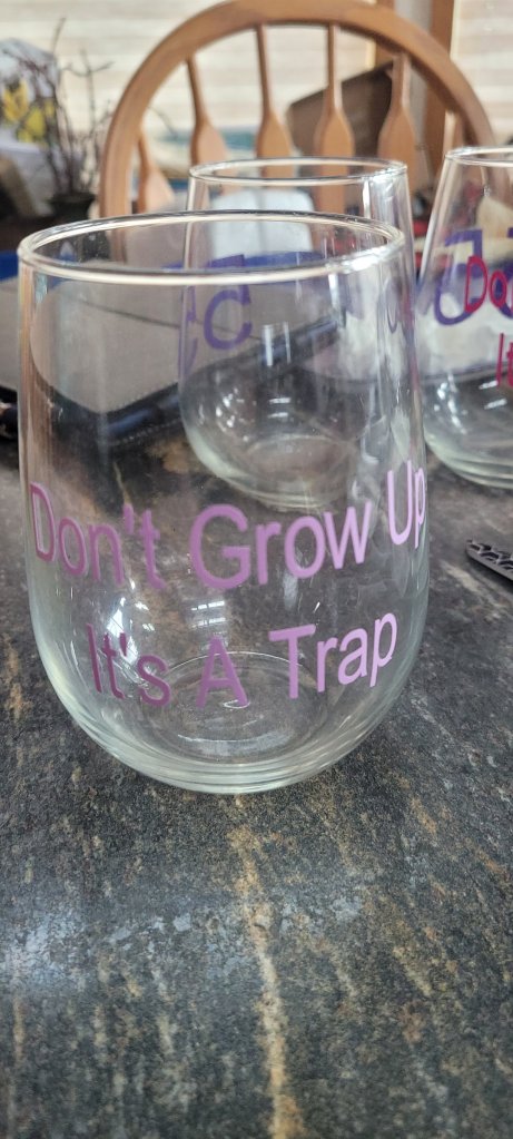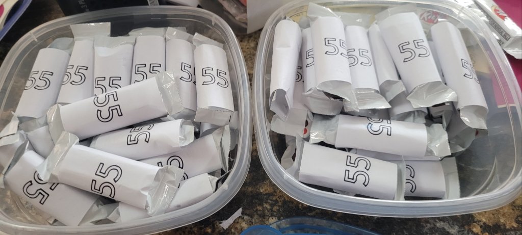 I made wine glasses that have 55 on them Mine says Don’t Grow Up, It’s a trap! With 55 on the back. Made white KitKat bar wrappers that said 55 on them.
