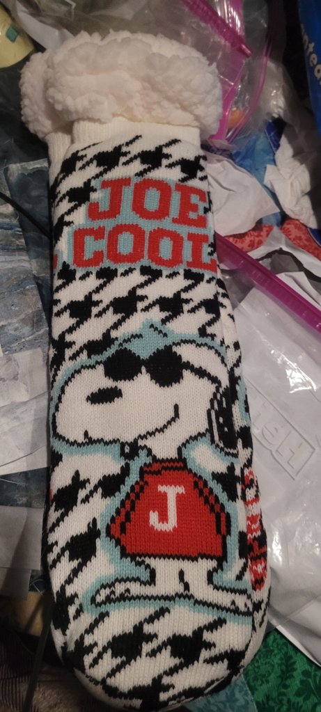 It was jam packed with fun stuff, A pair of Snoopy socks, puzzles, Friends playing cards, wine gummies and a stuffed bear.