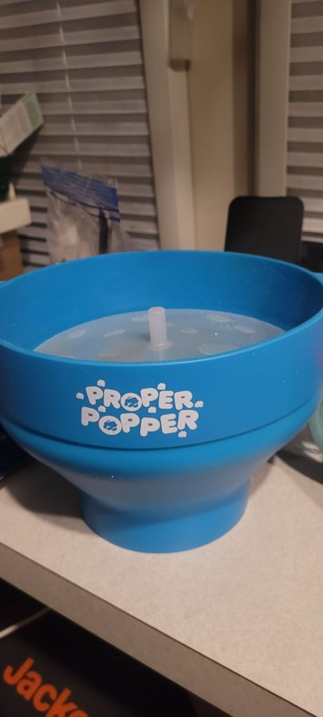 Molly had this cool popcorn popper for the microwave in SC and I got one also. That thing is great and doesn’t hardly have any extra unpopped kernels.