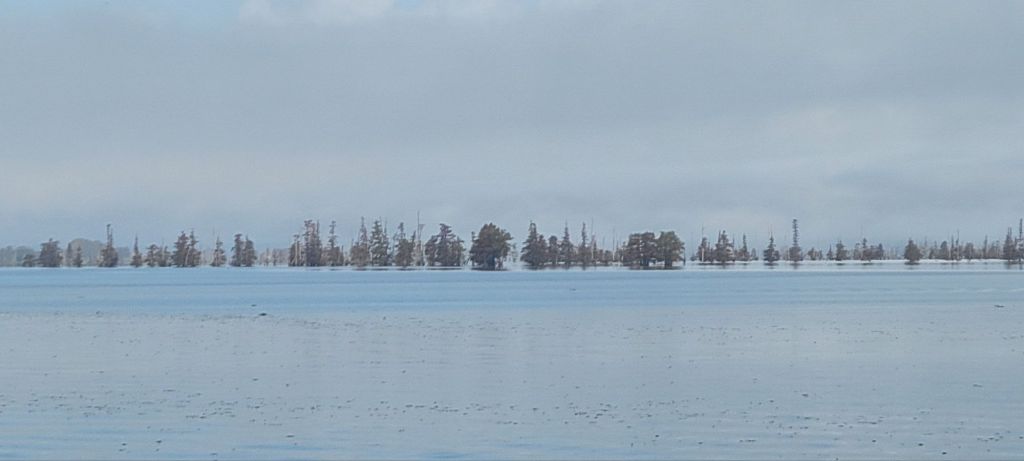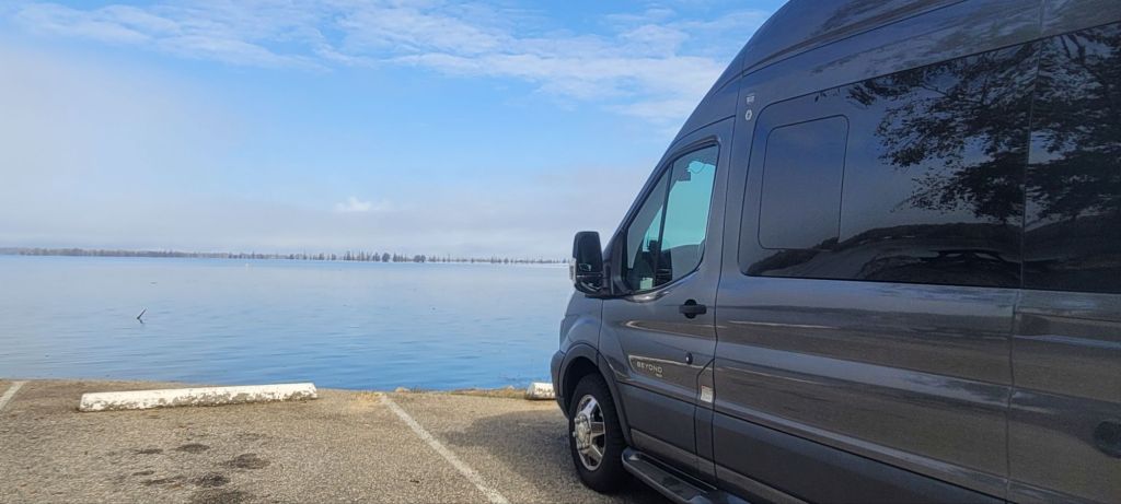 Very cloudy and van needed solar light. I drove around the park and then found the best parking lot at the Marina with full sun. So I stayed there until all the fog burned off.