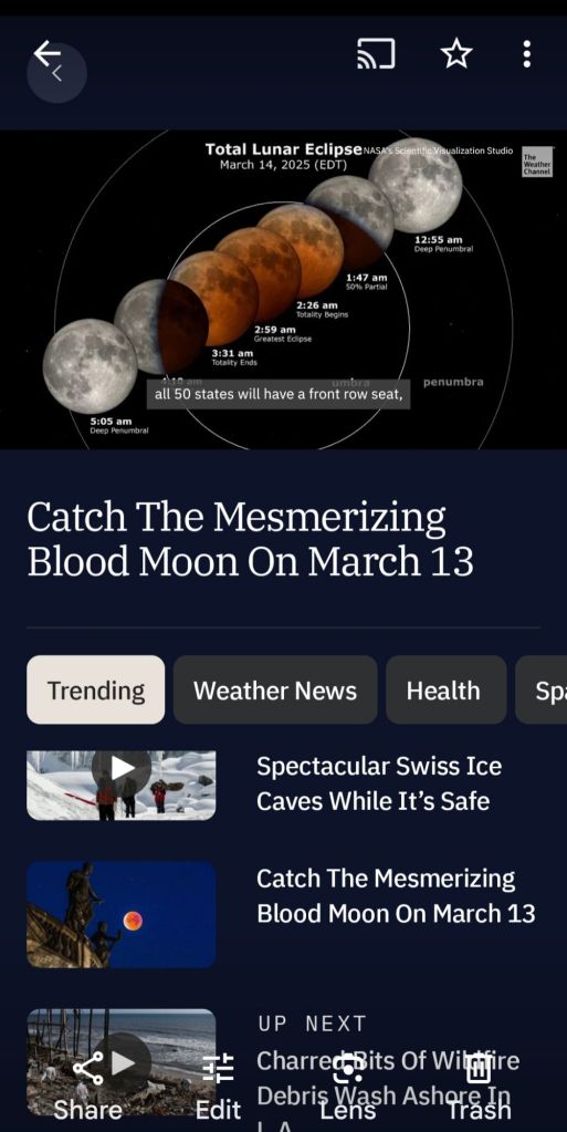 Day 120 – Feb 26 Weds. 0 March 2, 2025March 2, 2025 Written by Glamper Jan Planets are supposed to align until Friday. Then we can see a blood moon on March 13. Happy trails. Share this: Like and Follow Thx! Click to share on Facebook (Opens in new window) Facebook Click to share on Pocket (Opens in new window) Pocket Click to share on WhatsApp (Opens in new window) WhatsApp More Click to share on Pinterest (Opens in new window) Pinterest Like Loading...